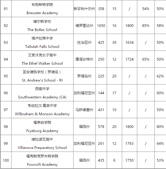 美国寄宿高中TOP100排名