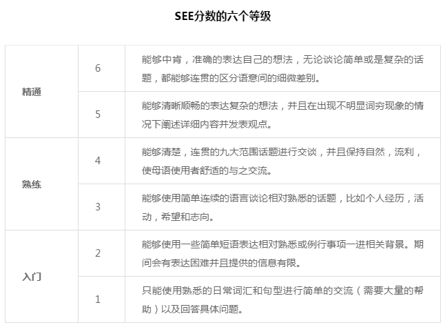 参加面试者都会收到一份SEE测评报告,其成绩范围为0-6分(精确到0.1)。SEE成绩不仅衡量了参加面试者的英语语言水平,还反映了其使用英语的实际交流能力。