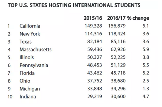 吸引留学生最多的州是加州、纽约州、德克萨斯州、马萨诸塞州、伊利诺伊州、宾夕法尼亚州、佛罗里达州、俄亥俄州。在2016/17年,以上州留学生人数都有不同程度的增加。