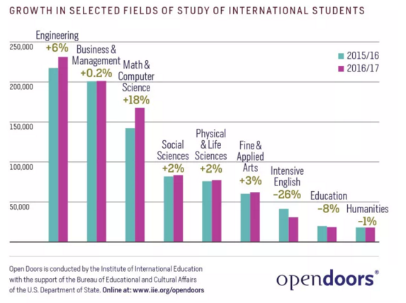 STEM依然是最热门专业,工程专业就读人数去上一学年增加6%,数学和计算机科学就读人数上升18%。商科管理虽然是第二热门的专业,但增幅不如工科类专业。下降幅度最大的是上英语强化课程的人数。教育专业人数也在减少。说明现在留学生选择专业越来越务实,会更多考虑未来就业。