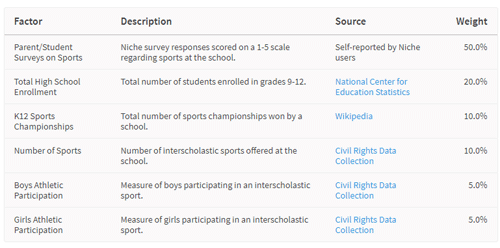 Niche网站根据学生和家长们对田径比赛、州冠军数量、学生参加体育项目以及学校为学生提供的体育运动数量等指标进行排名,最终得出这份2019全美高中体育最佳排名榜单。