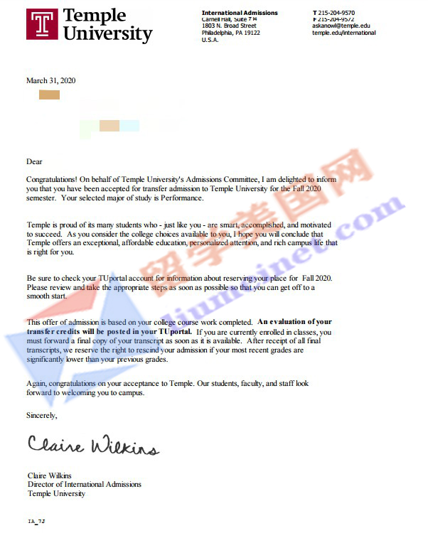大家好!再传录取捷报!在石老师带领下,经过留美网团队的共同努力,成功帮助Y同学申请到Temple University(天普大学)的录取,恭喜留美网Y同学!请见录取offer展示!每一个Offer的背后都凝聚了留美网所有同事的共同努力,再次祝贺Y同学!希望他在美国学业有成!同时感谢家长的配合和信任~