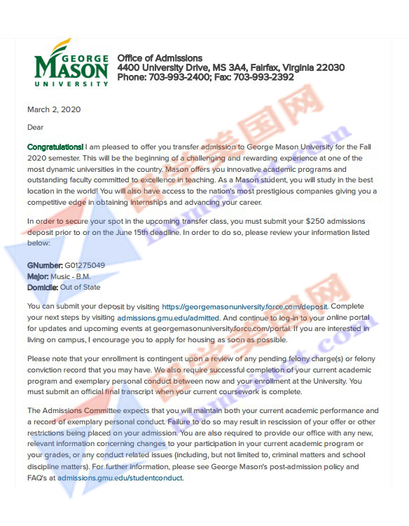 恭喜留美网L同学斩获George Mason University(乔治梅森大学)的录取offer!