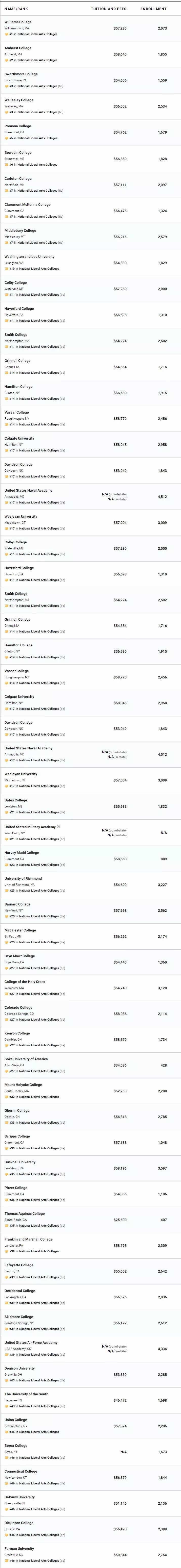 与综合大学相比,文理学院的排名稳定许多,威廉姆斯学院和艾姆赫斯特学院依旧牢稳占据第一和第二名,希拉里的母校韦尔斯利女子学院与斯沃斯莫尔学院依然是并列第三。