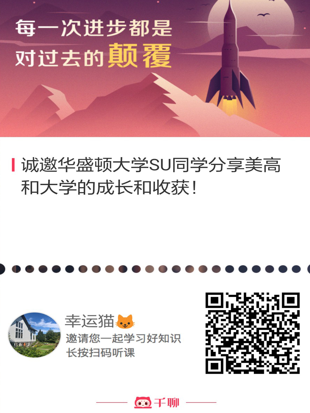 大家好!一周一次的千聊活动又要和大家见面啦!此次的千聊直播我们诚邀华盛顿大学SU同学为大家分享美高和大学的成长经历和收获!SU同学将从各方面为我们做分享,同时还会为大家解答疑惑!干货满满,有时间的家长一定要记得收听哦~锁定周日(5月17日晚上21:00分)千聊直播!感兴趣的家长赶紧加入我们吧,相信您听完之后一定受益匪浅~千万不要错过哦~