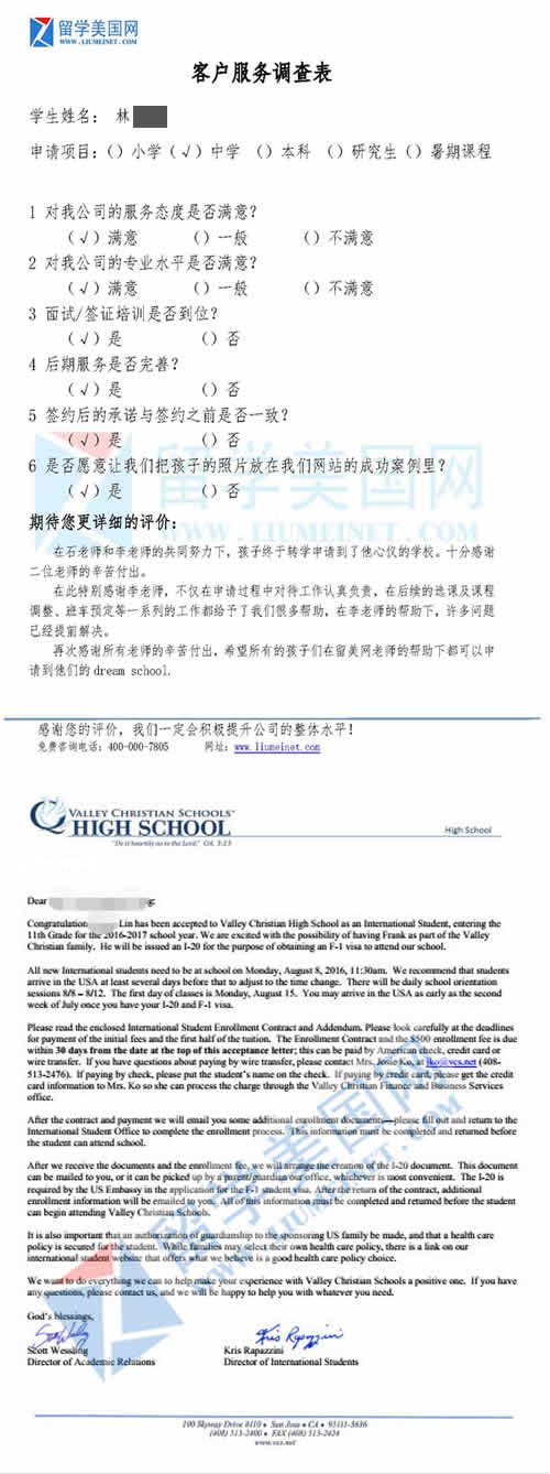 LYZ同学的满意评价表和山谷基督中学录取offer展示 【学校考察详情】