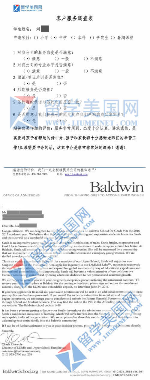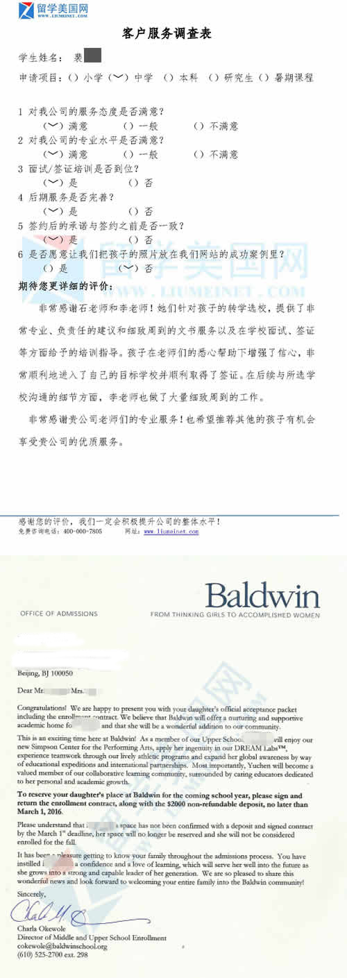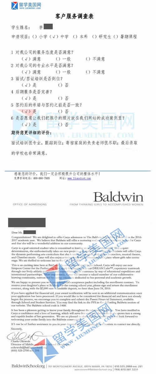 LYS同学的满意评价表和鲍德温女校录取offer展示 【学校考察详情】
