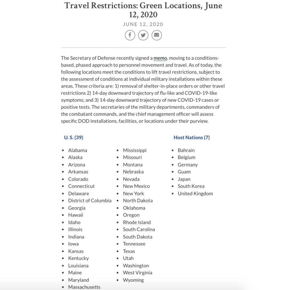 6月12日,美国国防部宣布取消对全球7个国家和美国39个州的旅行禁令。其中7国分别为巴林、比利时、德国、日本、韩国、英国和关岛。美国国防部称这些地方均已“符合解除旅行限制的条件”。随着日本和韩国的入境限制放宽,留学生可以将日、韩作为中转地入境美国。