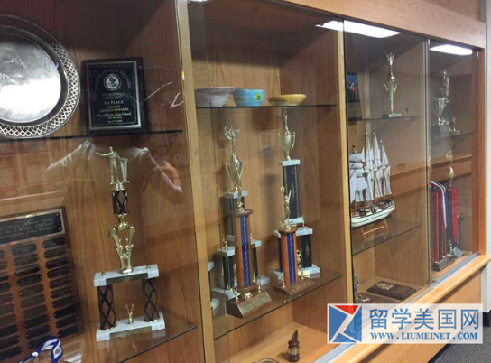 (学校的荣誉展览橱柜里面摆满了各种奖杯)