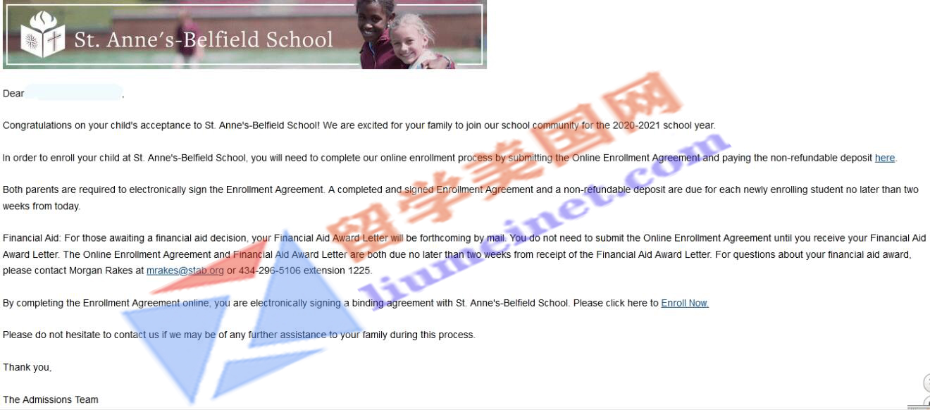 大家好!录取捷报!在石老师带领下,经过留美网团队的共同努力,在学校没有名额的情况下帮涂同学争取到面试,最终成功帮助涂同学申请到圣安妮贝尔菲尔德学校(St.Anne's-Belfield School)的录取,恭喜留美网Z同学!请见录取offer展示!每一个Offer的背后都凝聚了留美网所有同事的共同努力,再次祝贺涂同学!希望他在美国学业有成!同时感谢家长的配合和信任~