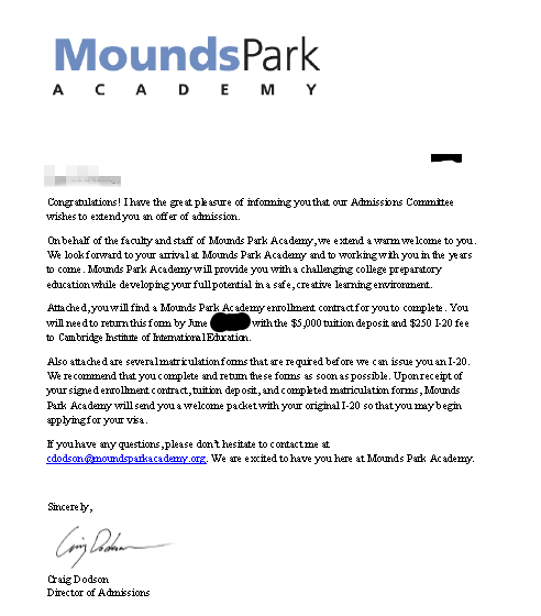留美网L同学Mounds Park Academy offer展示: