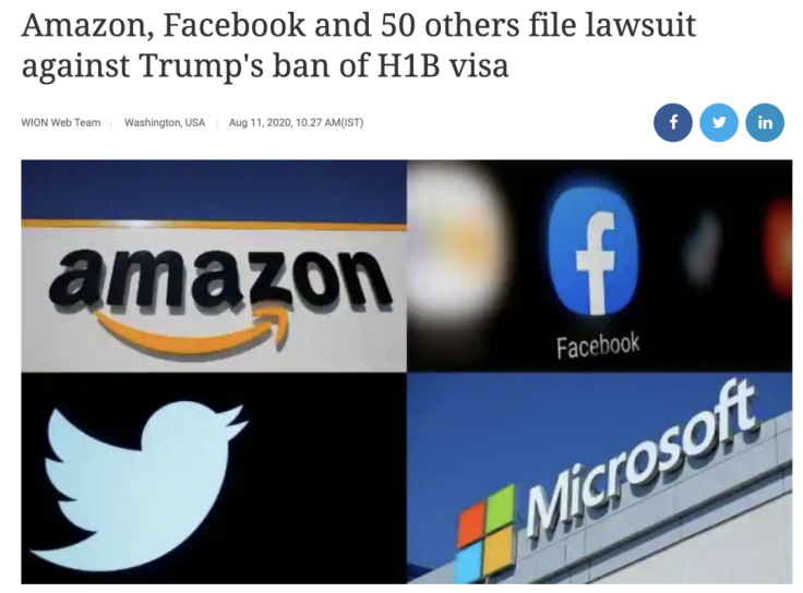 美东时间8月10日,52家美国科技巨头因为特朗普暂停签发 H-1B、H-2B、J-1 和 L 类签证直至年底的政策影响企业引进国际人才而将其告上法庭。