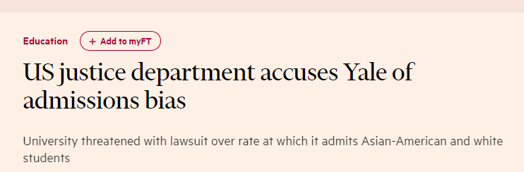 美东时间8月14日,美国司法部认为耶鲁大学在本科招生中非法歧视亚裔和白人学生,违反了联邦民权法。并警告称,在8月27日前耶鲁大学需要立即停止将种族因素作为录取标准之一,否则将面临诉讼。