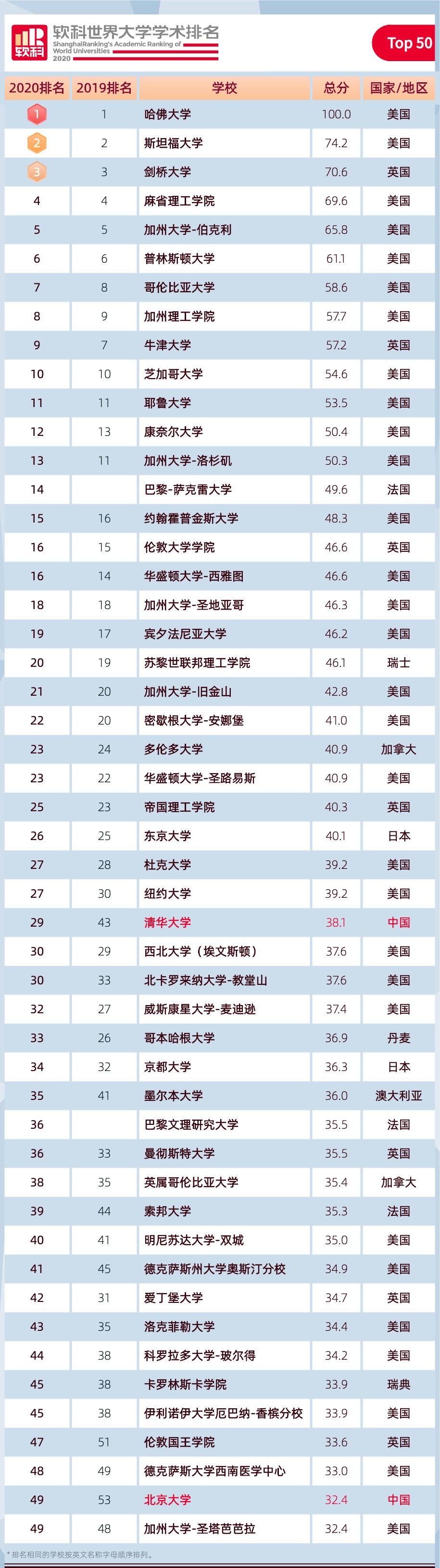 美国有206所大学上榜,前10中有8所来自美国大学,有30所美国院校跻身前50。哈佛大学仍然稳坐头把交椅,连续第18年蝉联全球第一,斯坦福大学仅次于哈佛大学,继续保持全球第二名。