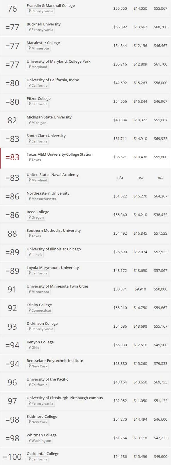 每所学校的总分数有40%来自教学成果,包括毕业生的工资和债务;30%来自学术资源,包括学校在教学上的花费;20%来自学生的参与度,包括师生互动;10%来自学习环境,主要是学生和教职工多样性。