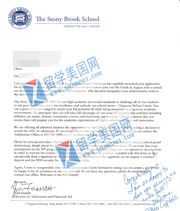 石老师曾走访考察过该校,The Stony Brook School石溪中学位于纽约的长岛北岸,纽约市以东50英里,与石溪纽约周立大学相邻。是一所基督教中学,校园内有自己的教堂,地理位置非常便利。附近有中国超市,还有三家中国餐厅。学校通过培养学生的个性,增长他们的知识,将学生培养成为未来社会的精英。杰出的学术、强烈的责任心,石溪中学以其在个性教育上的热情而闻名。石溪中学是美国最具多元化的的学校之一。学校提供严密的大学预备课程,结合了传统学术和竞技体育,可视化训练和艺术表演,并在基督教的框架下注重发展学生的个性和信仰。