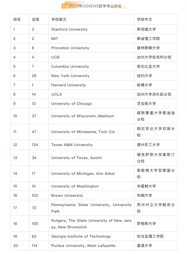 2020年USNEWS美国大学数学专业排名~