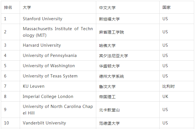 从榜单来看,美国大学仍然占主导地位,TOP100中有46所是美国的学校,而且荣登榜单的依然是斯坦福大学,麻省理工和哈佛大学也是牢牢占据了第二和第三的位置。