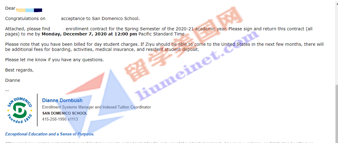 恭喜留美网L同学被圣多明尼哥中学San Domenico School录取~
