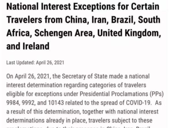 美国当地时间2021年4月26号,美国国务院领事事务局官网宣布,针对来自中国,伊朗,巴西,南非,申根国,英国,爱尔兰的学生及访问学者,新闻工作者,归入“美国国家利益例外NIE”,即不受赴美旅行限制,可以直接飞赴美国。