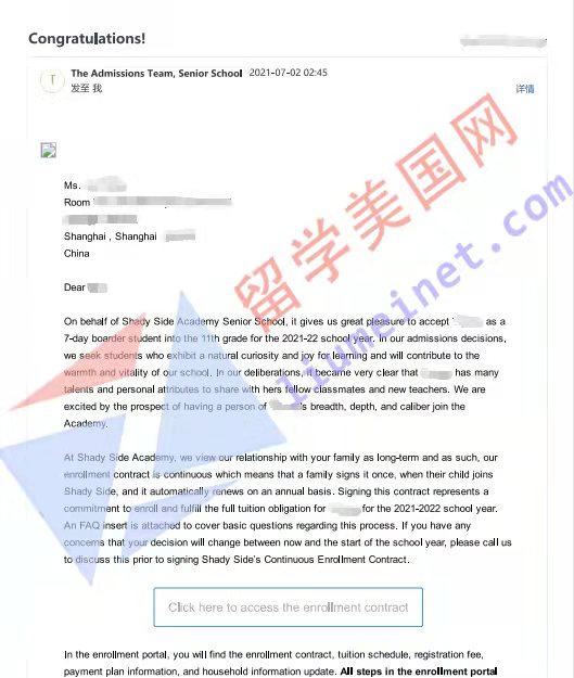 恭喜留美网L同学补录到宾州排名第一的顶尖寄宿学校Shady Side Academy!