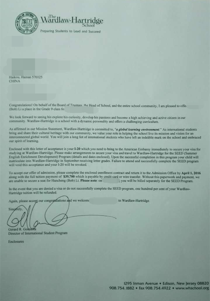 Wardlaw-Hartridge School位于新泽西北部的Edison,Edison市是美国大发明家爱迪生发明电灯的地方。爱迪生市中高收入家庭为多,教育投资多,学习环境好。学校旁边就是高尔夫球场,周边社区环境安全舒适,距离罗格斯大学10英里,距离普林斯顿大学45分钟,距离纽约一个小时路程,学校绝大多数学生来自当地美国白人中产家庭,白人学生的比例在90%以上。新泽西顶尖独立制百年走读学校,与教职员工及学生都采用1年制合同,全校师生必须全力以赴。