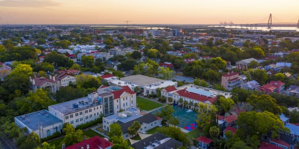 学校位于南卡罗来纳州的海滨城市查尔斯顿,是科佩尔(COOPER)河与阿什利(Ashley)河汇合处,在查尔斯顿湾的顶端,濒临大西洋的西侧,是南卡罗来纳州的主要港口,也是美国第四大国际港口。查尔斯顿是美国历史名城之一,每年都吸引大量游客,这里有美国最早的海关,美国最早的贩卖黑奴交易市场,美国南北战争纪念碑,还有历史悠久的古炮台。这里是美国最大的军港之一,著名的第七舰队的航空母舰等百艘军舰都停泊在海湾,游人可以在军港海军导游引导下坐车游览。