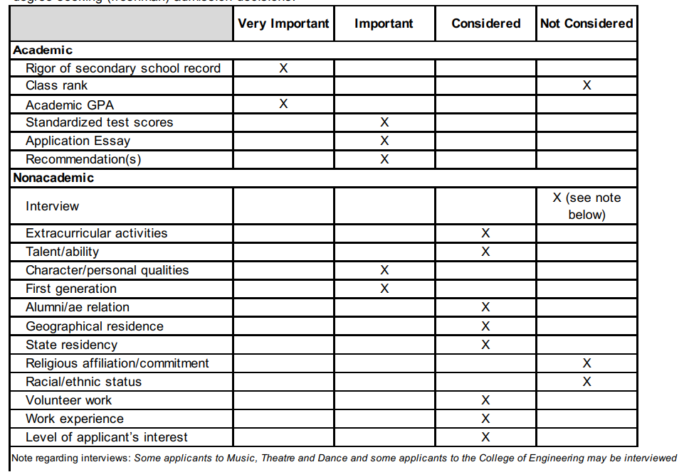 下图是美国大学在审查申请者材料时常见的考虑因素,UMich对这些因素也进行了重要度的排序: