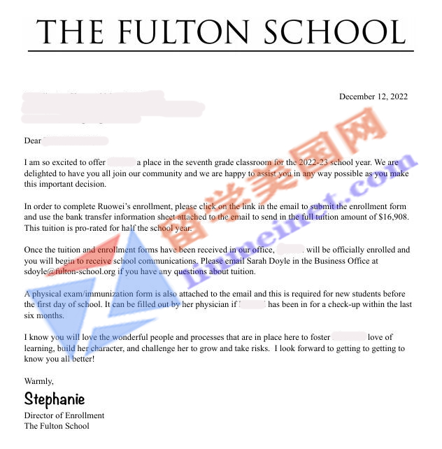 录取捷报~恭喜留美网C同学斩获富尔顿中学The Fulton School录取~