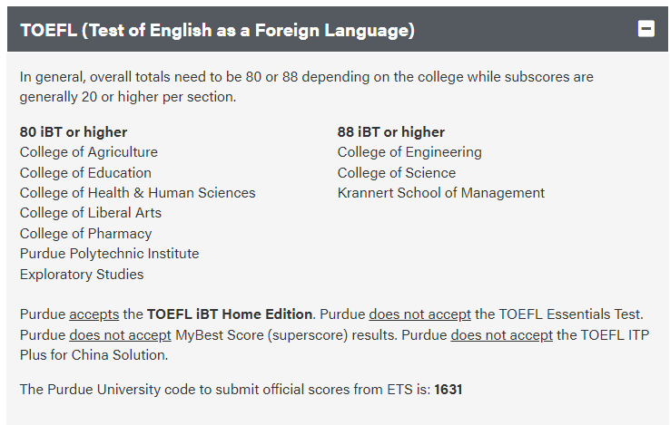 普渡大学对托福成绩的要求比较友好,最低成绩要求80分,且单项小分不低于20分,其中工程学院、理学院以及管理学院最低成绩要求88分。
