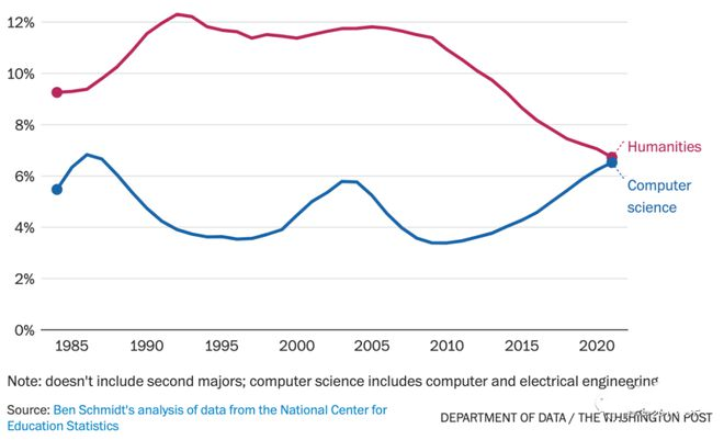 历史学家和数字人文主义者本施密特根据施密特对美国国家教育中心数据的分析,到2021年,相对于应届毕业生的整体规模,历史、英语和宗教等学科的毕业生人数不到2000年代早期鼎盛时期的一半统计数据。