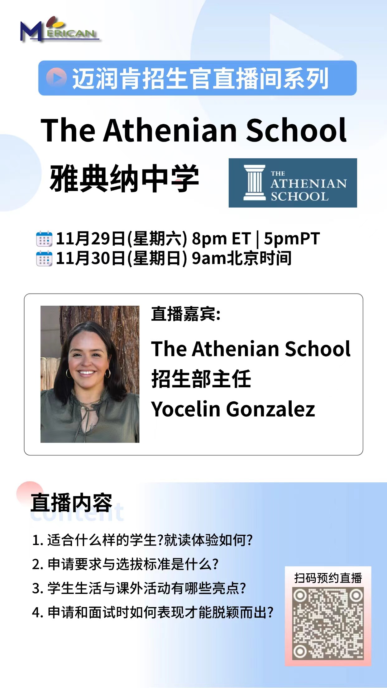 美国顶尖寄宿高中雅典纳中学招生官11.30直播详解2026申请,含在读生真实分享!