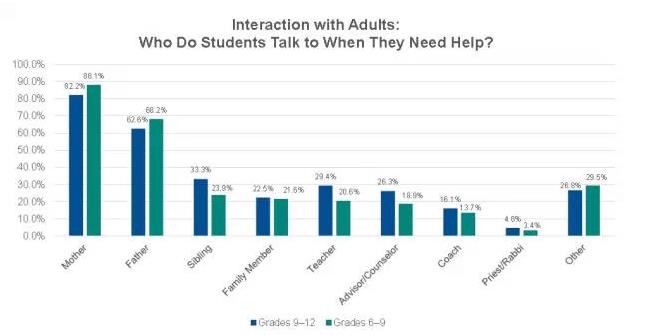在调查中,77.3%的高年级同学定期都会同成人聊天;89.5%的高年级同学会有一个知心好友共同聊天,低年级比例则在85%左右。 那么,当他们需要帮助时,会选择谁求助呢?在这一点上,不论是高年级还是低年级同学都非常一致,他们的首先都是母亲,父亲和兄弟姐妹、家庭成员分别次之。 会选择寻找老师帮助的高年级和低年级学生分别为29.4%和20.6%,相对来说,低年级学生更倾向于找母亲倾诉。