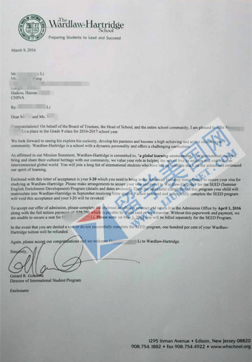 恭喜留美网LHC同学获The Wardlaw-Hartridge School优质中学offer