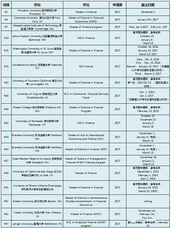 和大家分享2017年更新了DDL的金融项目院校的最新消息。截止到现在,在TOP50的院校中,有12所院校已更新了DDL。金融项目的院校一般都有2到3轮的申请机会,因此大家不必惊慌,赶不上第一轮的申请,也是有时间赶上第二轮的申请。