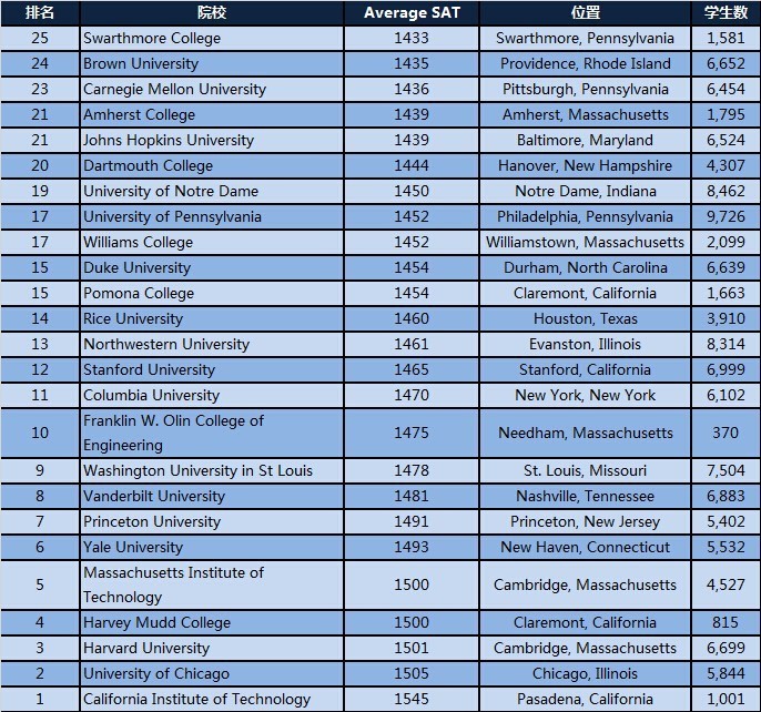 今天留美网给大家整理的全美最聪明的院校也是根据分数来评判的!因为几乎所有入围的名校都是要求申请者递交标准化考试成绩的——SAT或者ACT。所以这个成绩最具有代表性!