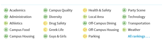 不同等级代表该校在这一项上由学生及家长评价出的综合分数,从中我们可以看出Niche的评分项范围之广:从学术到住宿饮食,从家长们最关心的毒品问题到天气及交通,包含了学校生活的全方位体验(注:因多数美国大学或多或少存在着吸食毒品的不良少年,基本所有学校在drug safety这一项上分数都较低,请家长比较不同学校的等级来评价,不要因为看到C或C-就认定学校中毒品泛滥)。因用户需填写个人信息进行注册,网站中的信息基本是真实可信的。同时,用户们在针对其中一项做出评分之外,还会具体写上一些相关体验和评分理由。正因为如此,Niche也被戏称为学校领域的“大众点评”。