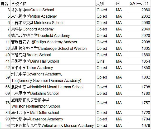 前百名的美国中学名校,从第三名开始,到第98名,有17所是在马萨诸塞州(Massachusetts)的。以下是17所麻省的美国重点高中。