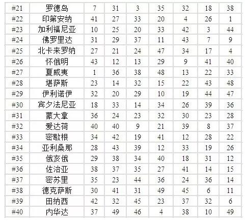 在这个排名中,拥有哈佛和MIT等名校的教育大州马萨诸塞位居第一,而纽约、加州的传统意义上的大州则排名中等,而排名垫底的基本上是清一色的南方州。