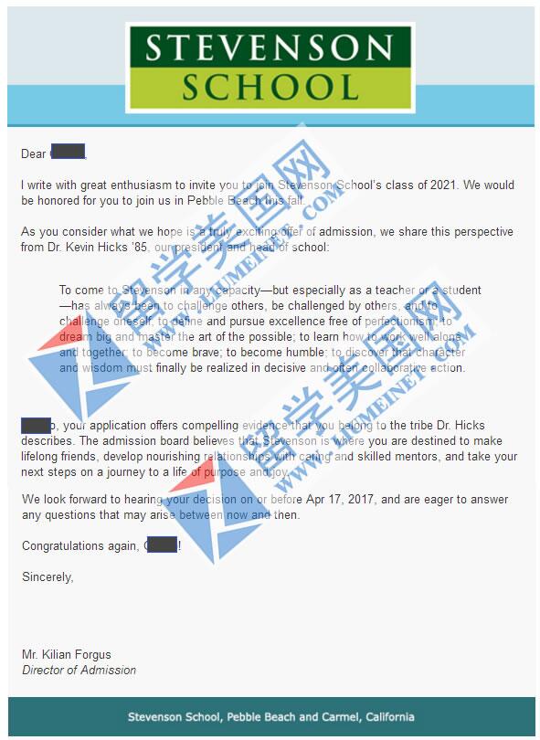 过程:申请史蒂文森(全美寄宿前50)是从WL转正的,在申请的过程中G同学转正的机会非常小,我们一直与学校保持紧密的联系,积极争取,用真诚的心和实际行动打动了学校,最终经过留美网文案团队的协同努力,以及家长的配合,这个offer终于拿到了,这是一个饱含凝聚力的offer,也证明了留美网的实力!