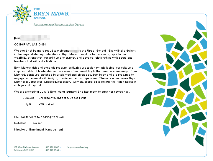 恭喜L同学成功补录到顶尖女校Bryn Mawr School