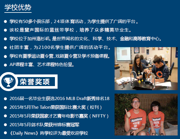 导读:查米纳德预备高中是一所男女走读混校,65%教师拥有研究生以上学历,学校位于位于美国经济文化中心洛杉矶市,地理位置绝佳!SAT平均分1730!蜚声国际的蓝丝带学校,培养了众多精英毕业生,1994年迪士尼著名电影《狮子王》主人公幼年辛巴一角的配音Jonathan Taylor Thomas即为本校2000届校友。学校紧邻南加州大学、加州大学洛杉矶分校(UCLA),有着良好的学校环境和校风!学校升学率100%,毕业生遍布常青藤名校,升学走向如下:普林斯顿大学、哈佛大学、耶鲁大学、斯坦福大学、哥伦比亚大学、芝加哥大学、杜克大学等。》》申请热线:400-000-7805,微信:liumeinet2014