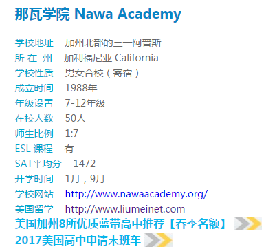 该校成立于1998年,位于美国加州法国峡谷,现有学生55人,校园包括225公顷的树林,树林与和河流,使学生们能够集中精力在一个宁静安全的环境里学习。该校是一所信誉良好的小型私立寄宿学校,位于美国加利福尼亚州北部的中心区,靠近Redding市。即使学校被美丽的山川和湖泊所环绕,但是前往旧金山,萨克拉门托和雷诺的交通都十分便利。在那瓦这个小型学校,每一个学生都是重要的和受欢迎的。学术上的挑战和成功是因为保持一个非常低的学生老师的比例,即对每个班级的学生人数限制在平均12人来实现的。老师们用多样的教育策略和评估技术更好的让学生能学习和保留知识。在各个专业学科中我们强调各个学科间的横向学习以提高对不同的知识的连续性的思考和分析。