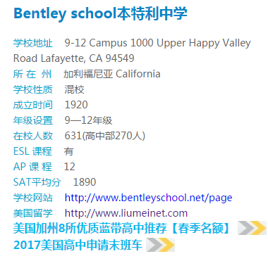 本特利高中在旧金山东湾区教育行业一直居于领先地位。凭借深厚的师资力量,优秀多元的生源和完善的软,硬高科技设施,该校推出的顶尖教育使每一位在校学生得到学业、艺术、体育、个人素质的全面提高。其毕业生都以优异成绩进入美国名校。本特利中学相信,无论学生是在一年级还是在十年级,其潜力都能得到充分发掘,进而取得优异的学术成就。Bentley School 本特利高中升学率为100%,部分入读大学为:布朗大学、哈佛大学、斯坦福大学、达特茅斯学院和贝勒大学等知名院校。