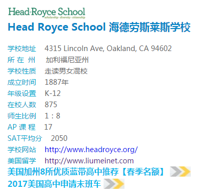 海德劳斯莱斯学校是一所男女混合的走读制大学预备,科技,艺术,STEM,机器人学校,年级从K-12,成立于1887年。位于市区的校园占地14英亩,有8所建筑。学校是由加利福尼亚州教育部,NAIS批准的私立学校。学校总捐赠基金高达$:1500万,总注册人数875人。高中部平均每班16人,师资比例1:9。高中学生每年需到校175天,每周上学5天,每天7小时。