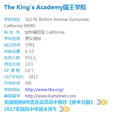 The King's academy是一所大学预备高中和初中。国王学院致力于让毕业生心智成熟,学业优秀,具有道德准则和信心。学校总人数931人,其中6年级109人,7到8年级231人,9到12年级521人。学校欢迎来自世界各地的国际生,国王的学院十分重视学生的学术和大学的规划。我们的综合项目包括每个年级家长信息展示、个人咨询,以及最先进的工具。通过这个过程,学生意识到自己的能力, 使他们能够追求自我。最后,学生能够有信心选择最匹配自己的大学。
