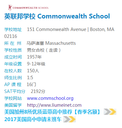 英联邦学校Commonwealth School是一所男女混合制的走读学校,拥有155名来自世界不同国家的学子们聚集。学校坐落于马塞诸塞州的首府波士顿的第151英联邦大道上,环境优美,气候宜人,英联邦学校Commonwealth School的任务是教育青年成为来自世界不同背景、不同思想以及不同创造性的人才。锻炼孩子们的分析能力,负责任的态度以及强有力的领导力。努力帮助学生们创造一个温暖的,富于变化的,激发潜力的学校群体。学校课程设置丰富,除了提供普通课程之外,还提供特别课程,荣誉课程,学生可自主选择!
