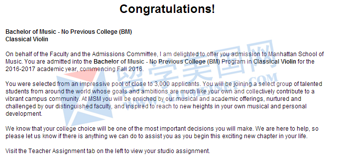 【美国大学热招】恭贺留学美国网学生被美国曼哈顿音乐学院录取